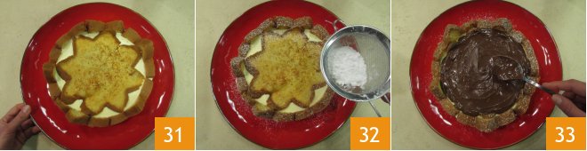 Retrieve the cake and transfer it to a serving plate 31. Dust only the tips with powdered sugar 32. Then spread Nutella® over the entire surface 33,