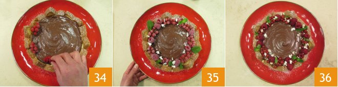 and garnish with currants 34, raspberries, and crumbled nougat 35. Complete with a few mint leaves and your pandoro ring with Nutella® is ready 36!