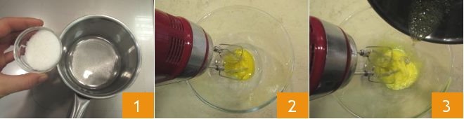 To make the pandoro wafer with ricotta mousse and Nutella®, first soak the gelatin in cold water, then prepare the syrup: pour 0.5 oz of water into a small saucepan, add 1.4 oz of sugar 1 and bring the mixture to a temperature of 250°F. Place the egg yolks in a bowl and beat them with an electric mixer 2, then pour in the sugar syrup in a steady stream 3