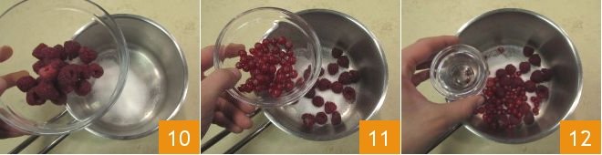 In the meantime, you can prepare the red fruit sauce: pour the sugar, raspberries 10, redcurrants 11, and 0.2 oz of water 12 into a saucepan