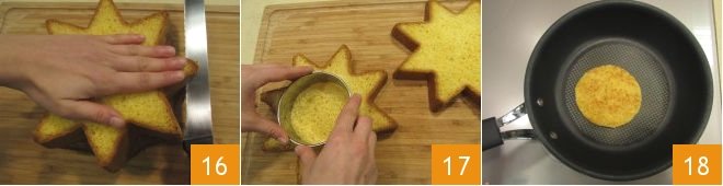 After the mousse chilling time, you can focus on assembling the dessert: cut the pandoro into horizontal slices about 0.4 inches thick 16 and use a 3.5-inch diameter pastry cutter to make discs 17. Place the pandoro discs on a hot pan and lightly toast them on both sides 18.