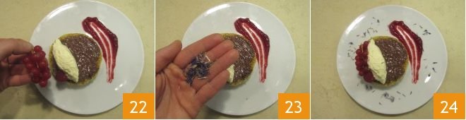 and garnish with a raspberry and a sprig of redcurrants 22. Finally, decorate the plate with edible flowers 23: your pandoro wafer with ricotta mousse and Nutella® is ready to be served 24!