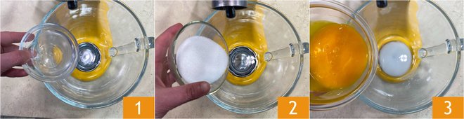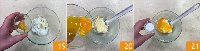 Flavor with orange paste 19 and mix with a spatula. Now incorporate the egg yolks 20 and salt 21.