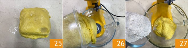 Retrieve the first dough from fermentation in the fridge 25, place it again in the stand mixer with the hook 26 and add the flour 27. Start at minimum speed to re-form the gluten structure; it will take about 30 minutes.