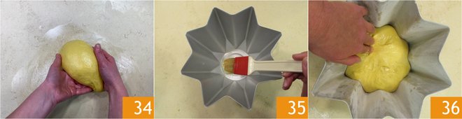 At this point, round the pandoro, always with hands slightly greased with butter 34: rotate it on the work surface with the palm of your hands, being careful not to lift it. Then take the dough in your hands with the help of a scraper and squeeze it on one side to remove air. Butter and dust with powdered sugar a 2 lbs pandoro mold 35, then place the dough inside 36.