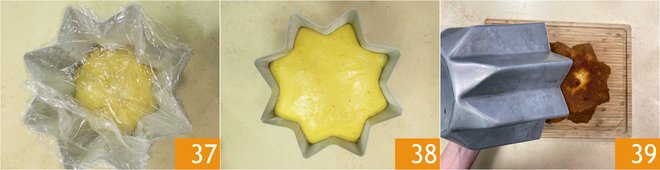 Cover with plastic wrap 37 and let rise for 8 hours in the turned-off oven, always with a glass of hot water and the light on. When the dough reaches the edge of the mold 38, make holes with a toothpick at the star points and a few holes in the center; this operation will allow the release of gases retained during leavening, thus achieving a compact crumb. Bake in a static preheated oven at 300°F for 50-55 minutes, placing the mold on the first rack from the bottom; the pandoro will reach a height of about 9 inches and should have a nice hazelnut color. Remove the pandoro from the oven and let it cool in the mold for 90 minutes, then unmold it 39.
