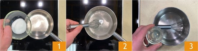 To prepare the panettone cake, start with the soak: pour the water and sugar into a saucepan 1. Turn on the heat and bring to a near boil while stirring 2, the sugar should be completely dissolved. Let it cool and add the liqueur 3. Stir and set aside.