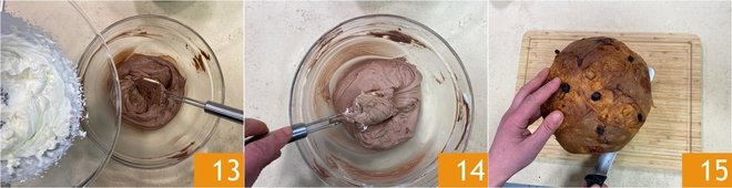 Incorporate the whipped cream into the hazelnut cream 13 by gently folding from bottom to top until you achieve a homogeneous cream 14. Transfer the creams into two pastry bags with a plain 12-14 mm tip. You are ready to assemble the dessert: take the panettone and, starting from the base, cut out two slices about 1.5 inches thick 15.
