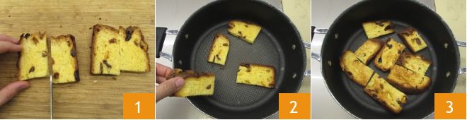 To prepare the panettone canapés with robiola and culatello, first cut the leftover panettone into 6 rectangles of about 3.5x2 inches 1 and toast them in a pan for 2 minutes on one side 2 and 1 minute on the other side 3.