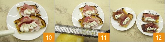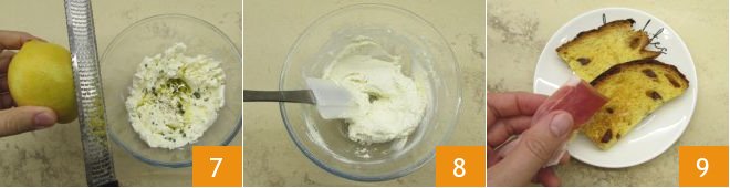 Also, grate the lemon zest 7 and mix with a spatula to soften the mixture 8, then transfer it into a piping bag. Now take the panettone slices and lay the slices of culatello on top 9.