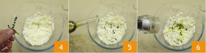 Set the panettone slices aside and focus on the cream: put the robiola in a bowl and add the thyme leaves 4, olive oil 5, and pepper 6.