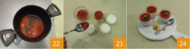 transfer back into the saucepan and cook for a few minutes until it becomes thicker 22. Let it cool slightly and pour over the semi-set panna cotta 23. Place back in the fridge for another couple of hours. When serving, garnish with basil leaves 24.