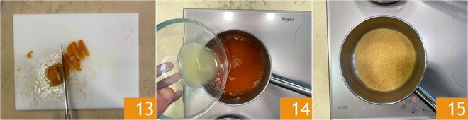 Peel the orange to obtain 200 g of segments 13. Pour the orange juice and lemon juice into a saucepan 14; heat it and in another pan pour the brown sugar 15. Distribute the sugar evenly and let it melt until you have obtained a caramel.