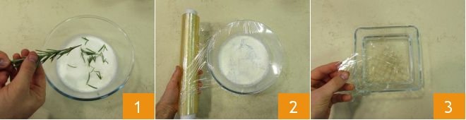To prepare the panna cotta with pomegranate jelly, start by infusing the rosemary sprigs in a bowl with the cream 1. Stir, cover with plastic wrap, and leave to infuse for 8-12 hours in the refrigerator 2. After the time has passed, soak the gelatin sheets in cold water 3.