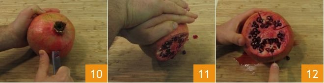 In the meantime, move on to the pomegranate jelly: remember that the fruit stains clothes and delicate surfaces, so equip yourself with an apron and cutting board. Cut the top part of the fruits 10, discard the cap, and then massage the fruit on the cutting board, rolling it under the palms of your hands: this will soften the pulp, and the seeds will come out more easily 11. Cut the visible four parts where the pulp is and open into wedges 12.