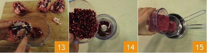 Deseed the pomegranate and collect in a bowl 13. Transfer the seeds to a blender (setting aside a few for decoration) 14, and make a puree. Transfer it to a sieve placed inside a saucepan 15,