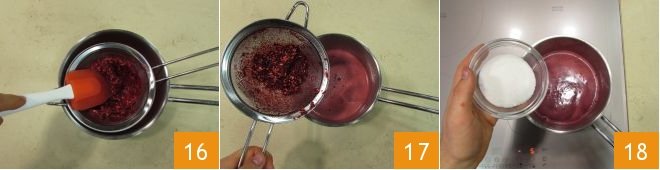 this way, you can press the seeds with a spatula, squeezing out more juice 16; you should obtain 11.6 oz; then discard them 17 and turn on the stove, add the sugar and stir 18.