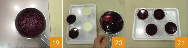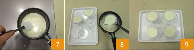 Stir thoroughly until completely dissolved 7. Transfer the panna cotta into 4 glasses with a capacity of 3.4 oz using a ladle 8, place them in the refrigerator using a tray. Then leave them in the refrigerator for an hour 9.