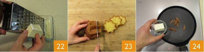 Meanwhile, grate the white chocolate and collect it in a bowl 22, then slice the small pandoro to obtain 5-6 stars 23. In a non-stick pan, melt the butter over low heat, and add the roughly crumbled cinnamon 24.