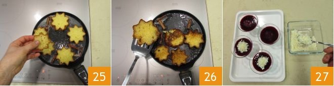 Place the pandoro slices 25 and toast them for a moment, raising the temperature slightly: be very careful not to burn the stars. Flip them and continue toasting for a few more moments 26. To garnish the panna cotta with pomegranate jelly, simply add some chopped chocolate in the middle of the jelly 27,