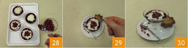 garnish the surface with a few reserved fruit seeds 28, and finally, the pandoro star 29. Plate the individual glasses on small plates and, if desired, garnish with a few rosemary leaves and some currants 30.