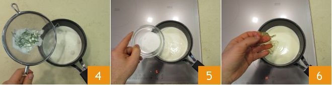 Meanwhile, strain everything directly into a saucepan 4, add the sugar 5, and bring to just below boiling, stirring occasionally. Turn off the heat and add the rehydrated and drained gelatin 6.