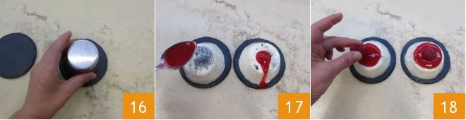Blend with an immersion blender 13 until you get a puree. Then strain the mixture 14 and set your coulis aside. When ready to serve the panna cotta, immerse the mold in boiling water for a few seconds 15