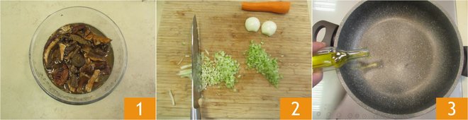 To prepare the pappardelle with lentil and mushroom ragout, first, rinse the dried mushrooms, then soak them in cold water 1 for at least 10-15 minutes, just enough time to prepare the rest. Now, take care of the lentil ragout: clean the carrot, celery, and onion, then chop them finely 2. Pour the extra-virgin olive oil into a saucepan 3.