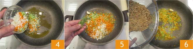 Add the chopped vegetables for the sauté 4, the thyme sprigs, and the garlic 5, and let them brown over moderate heat for about 10 minutes. In the meantime, rinse the lentils and add them to the sauté 6.