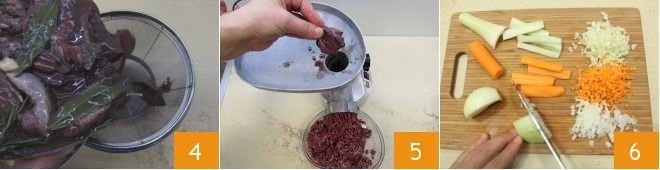 After this time, drain the meat from the marinade 4 and grind it with the appropriate tool 5. If you don't have a meat grinder, you can finely chop the venison with a knife. Now focus on the sauté: peel the carrot, celery, and onion, then finely chop them 6