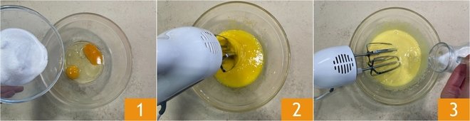 To prepare the Paradise Muffins, add the eggs and sugar to a bowl 1, beat with an electric mixer to combine 2, then slowly add the milk 3.