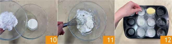 In a bowl, add the ricotta, drain if necessary, and the sugar 10. Mix with the whisk to obtain a cream 11. Butter and flour a muffin tin, then pour a couple of tablespoons of batter into 6 muffin molds 12.