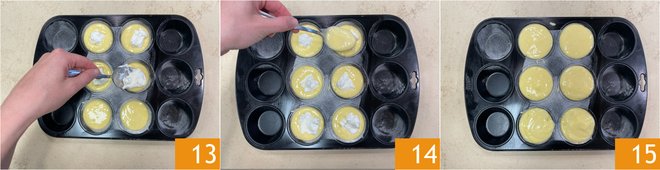 Gently place a teaspoon of cream in the center 13, then cover with the remaining batter up to the edge 14. Bake in a preheated static oven at 350°F for 20-25 minutes.
