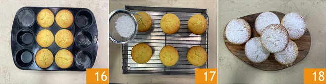 Remove the Paradise Muffins from the molds 16, let them cool, and then dust with powdered sugar 17 before enjoying them 18.