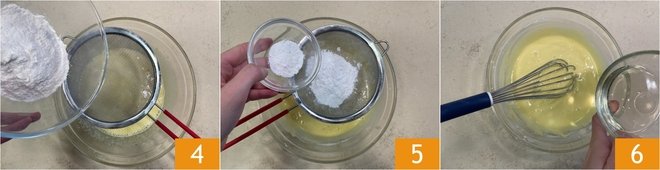 Incorporate the sifted flour 4, cornstarch, and baking powder 5. Mix again, this time with a hand whisk, then pour in the vegetable oil 6.