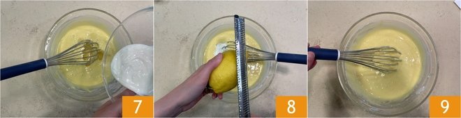 Add the yogurt 7 and grated lemon zest 8. Mix again with the hand whisk to obtain a homogeneous and lump-free mixture 9.