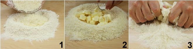 Start preparing the Parmesan shortbread cookies by placing the flour and finely grated Parmesan cheese in a bowl (or on a pastry board) 1, add the butter in small pieces, the salt 2, and the pepper, then knead with your fingers 3