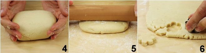 until you get a smooth dough 4 (if the dough seems too dry, you can add 20g more butter to the dough). Now, roll out the dough with a rolling pin 5, then, with the help of steel cookie cutters, cut out the cookies 6
