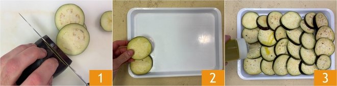To prepare the eggplant parmesan in the air fryer, first cut the eggplants into slices about 3/8 inch thick 1. Place the slices on a tray 2 and drizzle with a little oil 3.