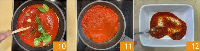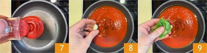 Meanwhile, prepare the tomato sauce: pour the tomato puree into a pan 7, then season with a little oil, a clove of garlic 8, and some basil leaves 9.