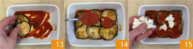Lay the eggplant slices, slightly overlapping them 13, then cover with plenty of sauce 14 and distribute the torn mozzarella 15.