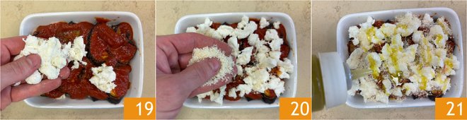 Sprinkle with grated Parmigiano Reggiano 16 and continue by repeating the layers in the same order: first eggplants 17 and tomato sauce 18.
