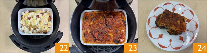 Transfer the baking dish to the air fryer basket and cook for 15 minutes at 374°F 22. Once cooked 23, let the eggplant parmesan rest in the air fryer for a few minutes before cutting and serving it 24!