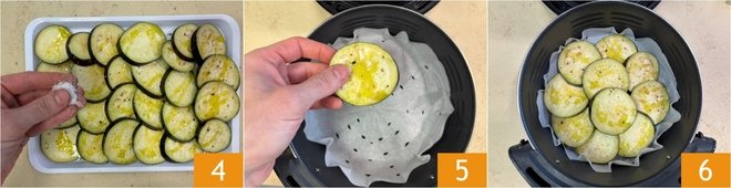 Add salt 4 and pepper, then transfer the eggplants to the basket of the air fryer (we used a fryer with a 6-quart capacity) 5. Cook at 392°F for 8 minutes 6.