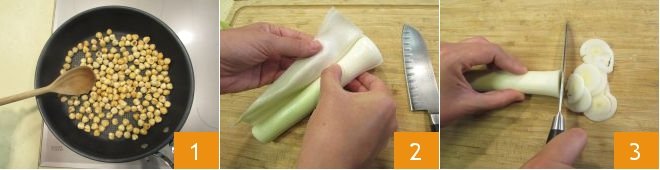 To prepare the parsnip and hazelnut soup, first make the vegetable broth following our recipe and keep it warm. Toast the hazelnuts in a pan for a few minutes to release all their aroma 1, but remember to check them often to prevent burning. Clean the leek by removing both the root and the green part, then remove the outer leaves 2 and slice it thinly 3.