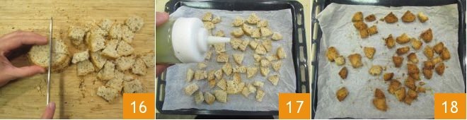 In the meantime, you can prepare the croutons: cut the multi-grain bread first into slices and then into cubes 16, distribute them on a baking sheet lined with parchment paper and season them with oil 17 and salt. Brown the croutons in a preheated static oven at 392°F for about 8 minutes 18.