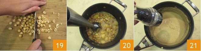 Coarsely chop the hazelnuts you set aside for garnish 19. After the soup cooking time, remove the sage leaves and blend with an immersion blender 20; if necessary, you can add a little broth to reach the desired consistency. At this point, season the soup with salt and pepper 21 and distribute it in serving dishes.