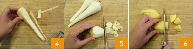 Peel the parsnip with a vegetable peeler 4 and cut it into not too small cubes 5. Do the same with the potatoes 6.