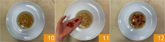 Plate the dish 10 and top with coarsely chopped crispy prosciutto 11. Your passatelli with prosciutto in meat broth are ready to be served 12!