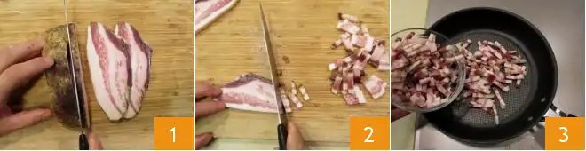 To prepare pasta alla gricia, first place a pot full of water on the burner that will be used to cook the pasta. At this point take the guanciale and cut slices 1/2" (1 cm) 1 thick. Then separate any rind that may be present (you can keep it in the fridge and use it in other recipes, such as soups) and from the slices you get strips about 1/8" (half a cm) 2 thick. Pour the guanciale into a pan already hot, without adding more fat 3;